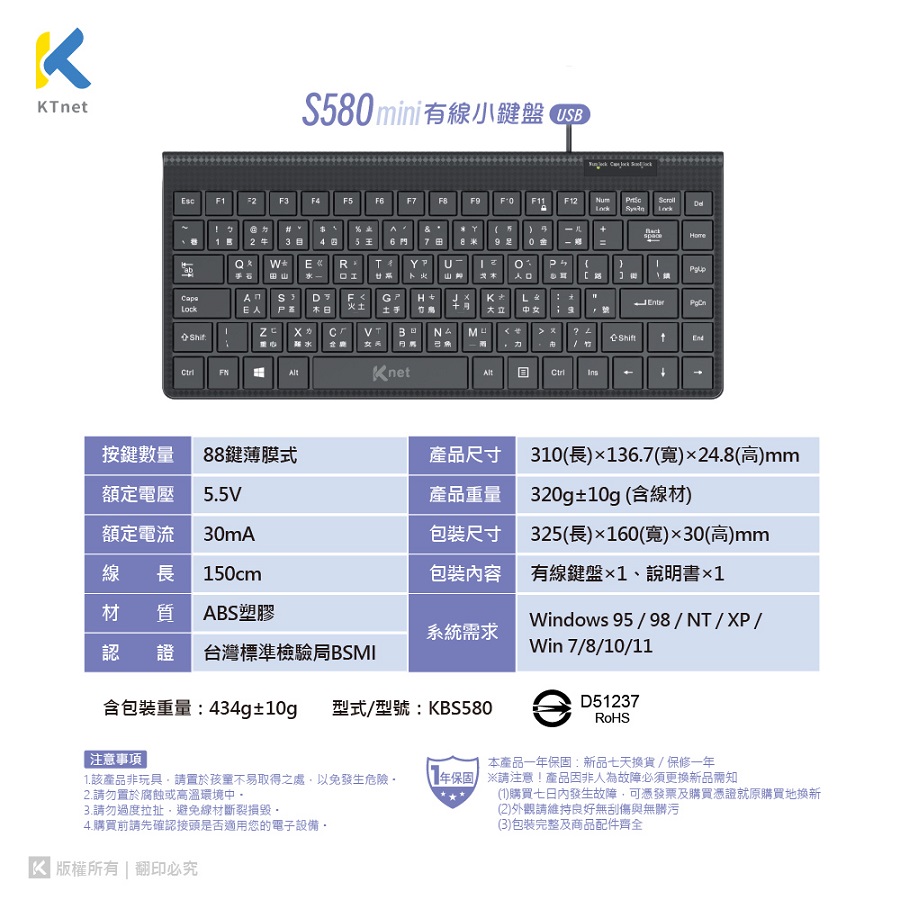 KTnet S580 88K鍵USB迷你有線小鍵盤