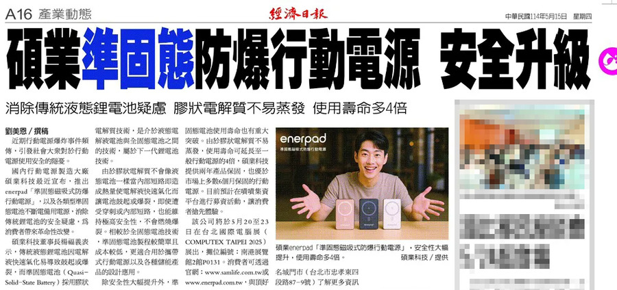 • 高安全性:即使遭受釘刺、跌落或強烈衝擊,準固態電池也不會燃燒,無需擔心液漏或爆炸。