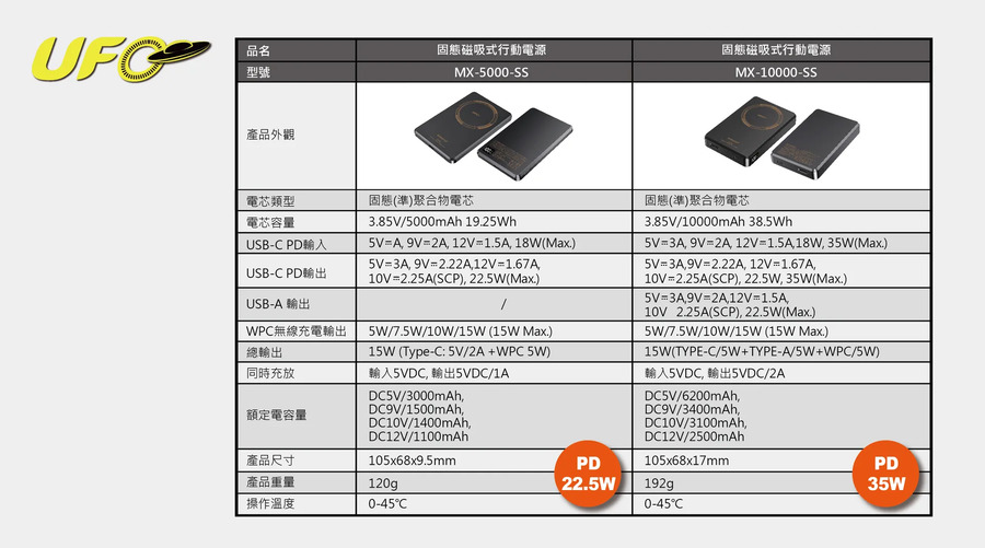 額定容量: DC5V/6000mAh, DC9V/3400mAh, DC12V/2400mAh TYPE-C PD輸入: 5V/3A, 9V/3A, 12V/2.92A, 15V/2.33A, 20V/1.75A, 35W(Max.)