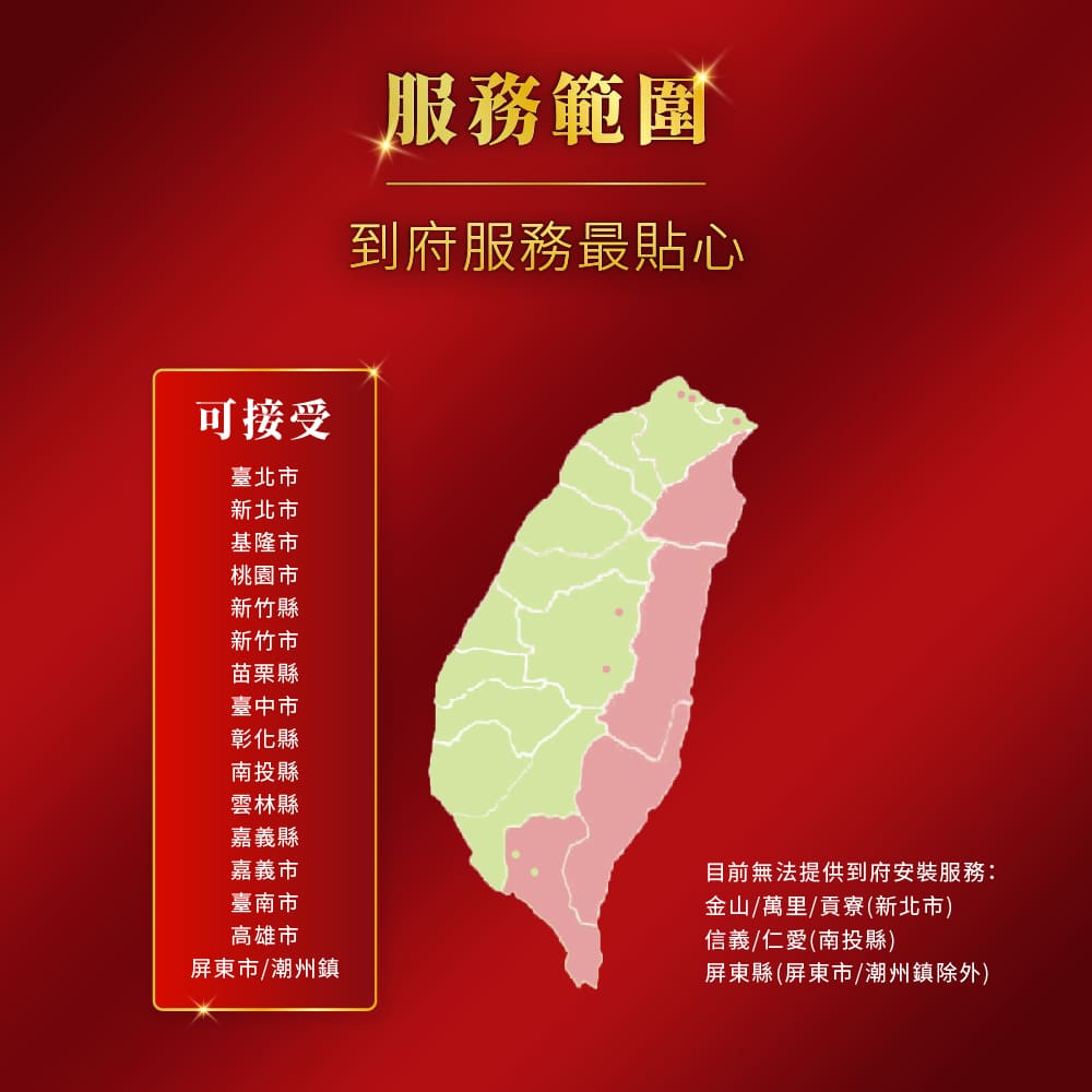 - 標準安裝:即指將商品拆箱定位完成;不包含其他拉線或額外施工等事項。
