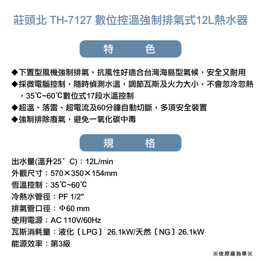 莊頭北12L熱水器數位恆溫強制排氣式(NG1)