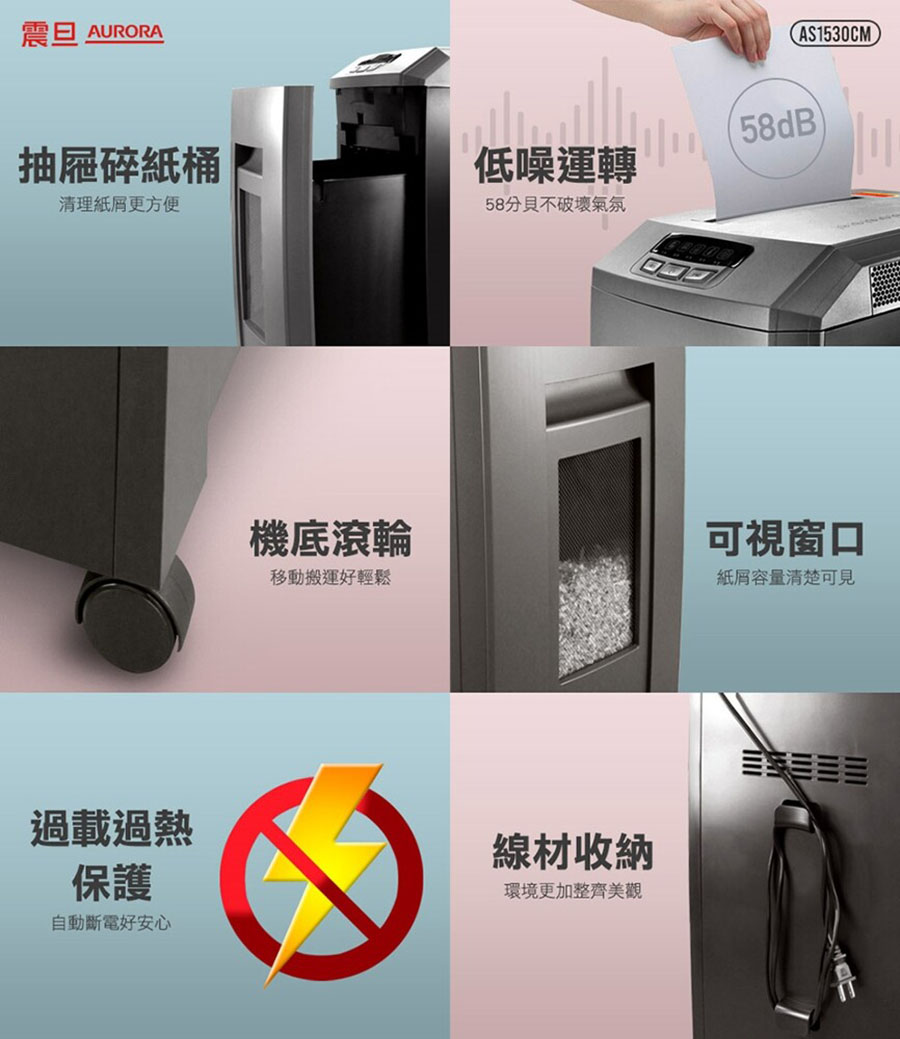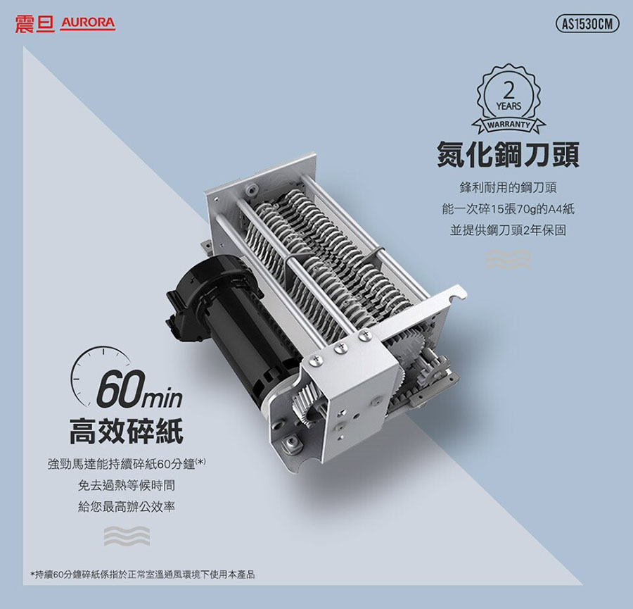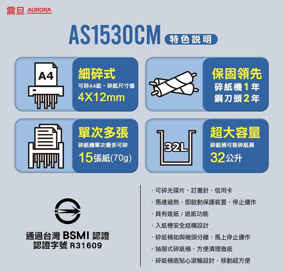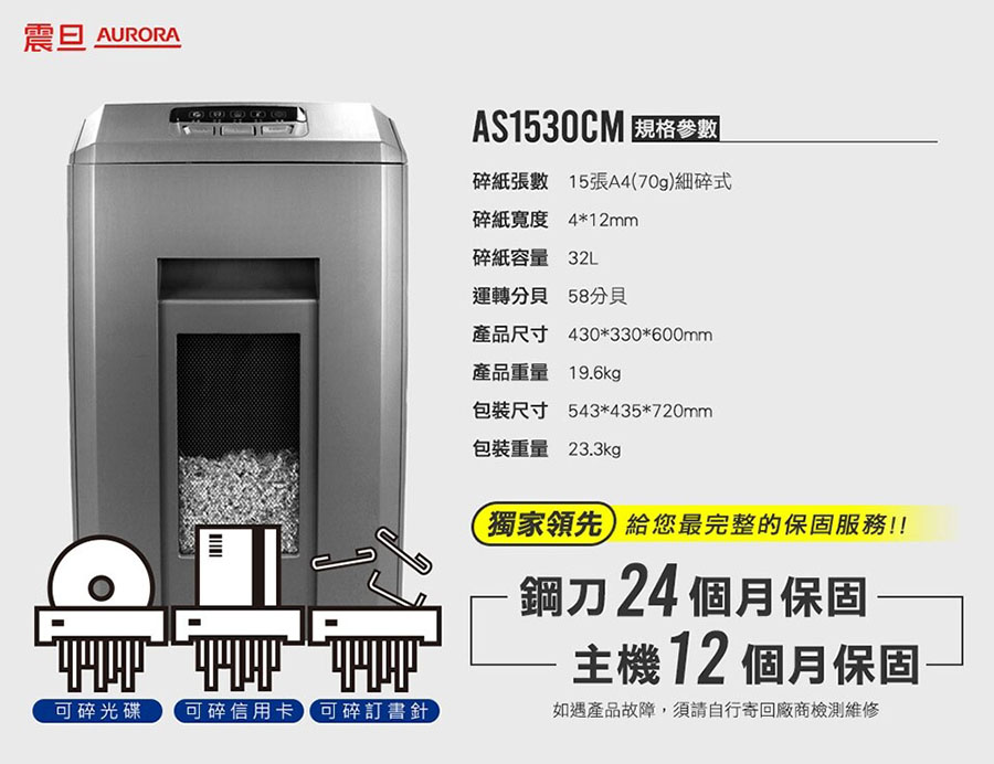 ● 碎紙張數:15張 ● 碎紙尺寸:A4(70g) ● 碎紙形狀:細碎式 ● 碎紙細度:4x12mm ● 可碎物:紙(含訂書針可)、信用卡、CD ● 運作音量:約58分貝 ● 可容納量:32公升 ● 機器淨重:19.6公斤 ● 售後保固:鋼刀2年/機體1年