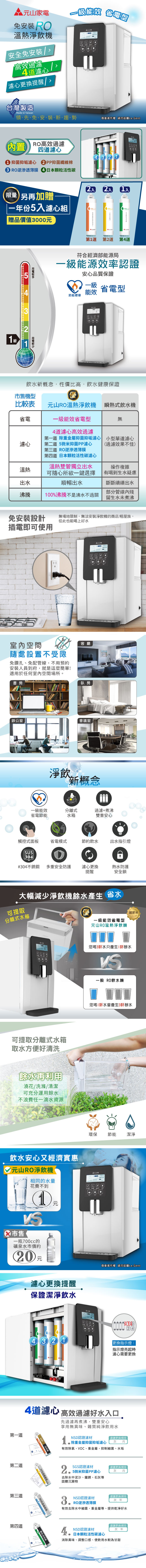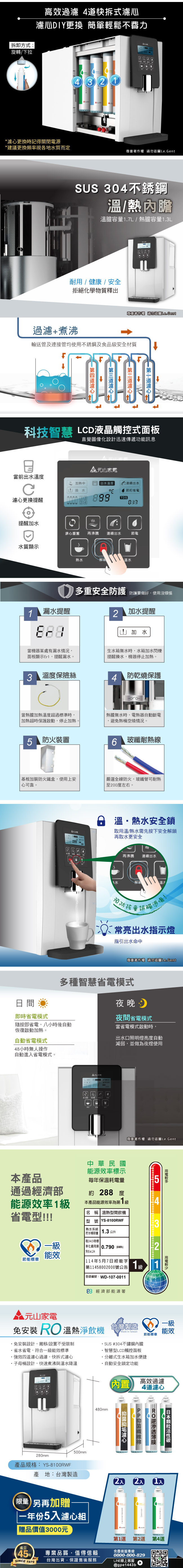 品牌:元山 型號:YS-8100RWF 額定電壓/頻率:110V/60Hz 總額定消耗功率:420W 加熱消耗功率:400W 熱水平均溫度:95°C 產品尺寸:高480 x 寬280 x 深500 mm 淨重:15.8kg(含濾心) 贈品:一年份5入濾心組 總容量:7.6L(規貼標示):飲用容量3.5L / 餘水容量1.1L / 熱水1.3L / 溫水1.7L 產品保證:明台產物保險2000萬產品責任險 製造沿革:42年專業製造,保證售後服務