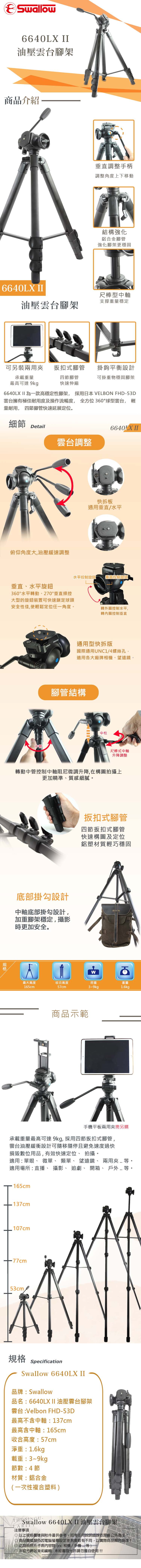 品牌:Swallow 品名:6640LX II油壓雲台腳架 雲台:Velbon FHD-53D 最高不含中軸:137cm 最高含中軸:165cm 收合高度:57cm 淨重:1.6kg 載重:3~9kg 節數:4節 材質:鋁合金 (一次性複合塑料)