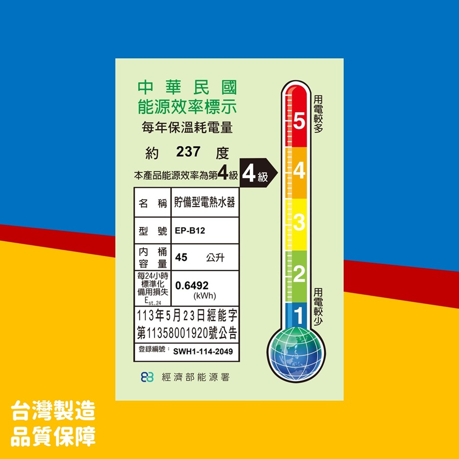 型號:EP-B12 容量:12加侖 直掛式 用電:4Kw /220V /約18安培 產地:台灣 適用人數:連續淋浴約1人 直徑高度:39 X 79公分(依實品為主) 電熱管材質:銅製電熱管 熱水器材質:不鏽鋼(內桶304/外桶430) 進出水口:1/2"(4分進出水口)