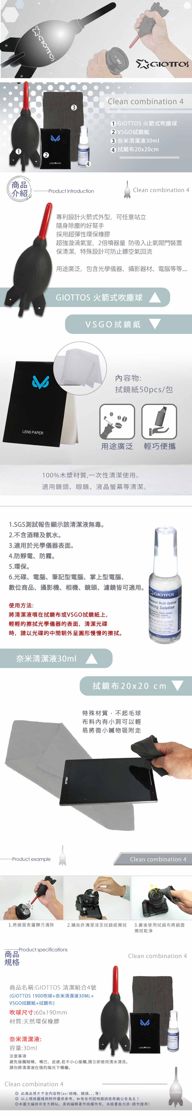 商品名稱:GIOTTOS 清潔組合4號 (GIOTTOS 1900吹球 奈米清潔液30ML VSGO拭鏡紙 拭鏡布) 吹球尺寸:60x190mm 材質:天然環保橡膠
