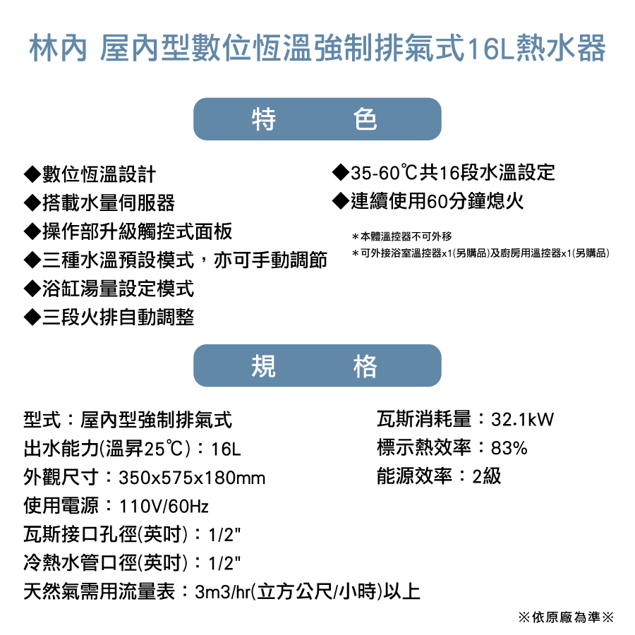 型式:屋內型強制排氣式(FE式) 出水能力(溫昇25℃):16L 外觀尺寸(WxDxH):350x575x180mm 使用電源:110V/60Hz 瓦斯接口孔徑(英吋):1/2" 冷熱水管口徑(英吋):1/2" 排氣管:5米3彎 ∮60mm 瓦斯消耗量:32.1kW 天然氣需用流量表:3m3/hr(立方公尺/小時)以上 標示熱效率:83% 能源效率:2級