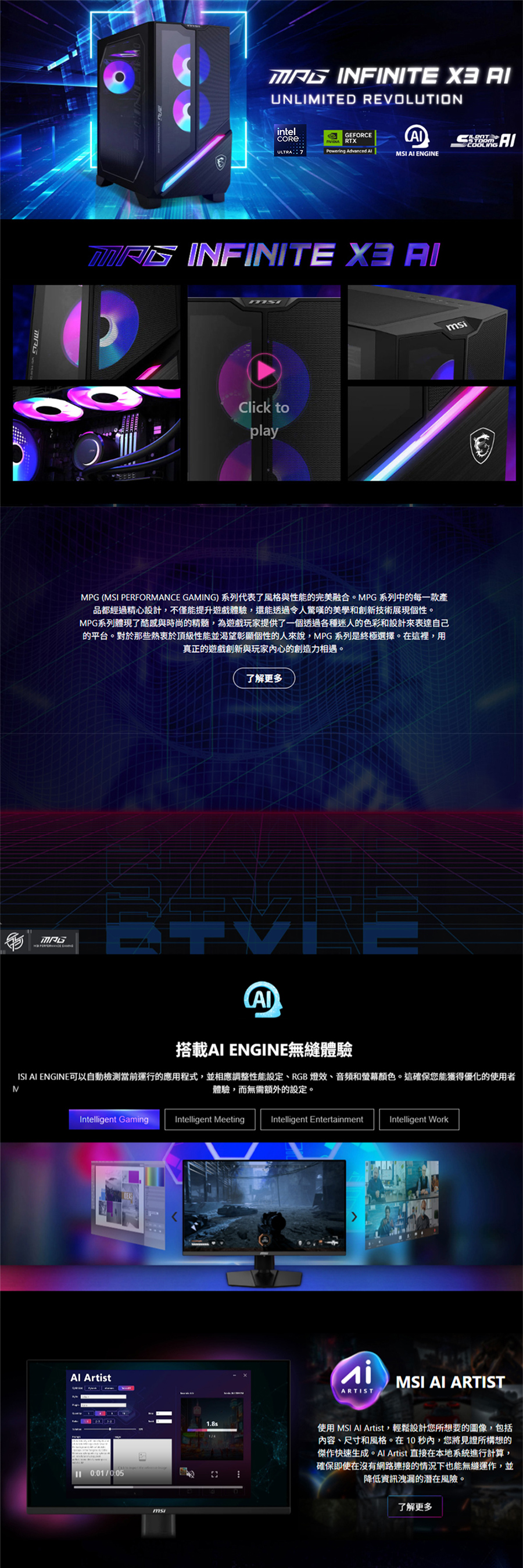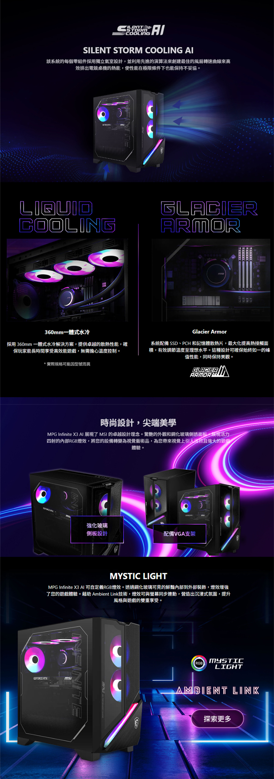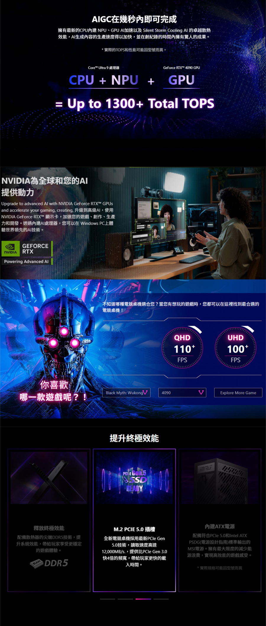 搭載第15代Intel Core Ultra 7 265K 處理器 搭載GeForce RTX 5070 Ti SHADOW 3X 16G 顯示卡 AI電競桌面 - AI 驅動冷卻、遊戲和遊戲串流強化功能 Frozr AI散熱設計- 透過 AI 演算法調整風扇轉速來優化氣流 Silent Storm Cooling 2 - 透過分離室優化氣流散熱 內建360mm一體式(AIO)水冷散熱器 Mystic Light RGB 燈效設計 符合EMI標準的透明側板設計 NVIDIA Studio認證 - 為創作者預裝Studio驅動程式和專用工具