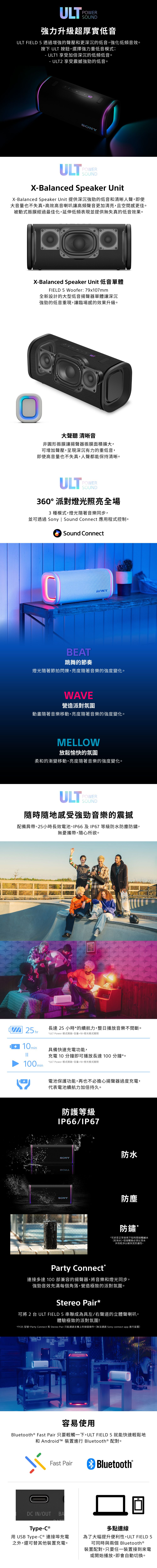 兩種強力重低音模式 增強的聲壓/更深沉的低音 IP66&67 防水/防塵/防鏽 25小時長效續航 3種模式360度派對燈光 10波段均衡器 自選音效設定 探測環境噪音 自動調校最佳化音場 隨附肩帶 輕鬆出行